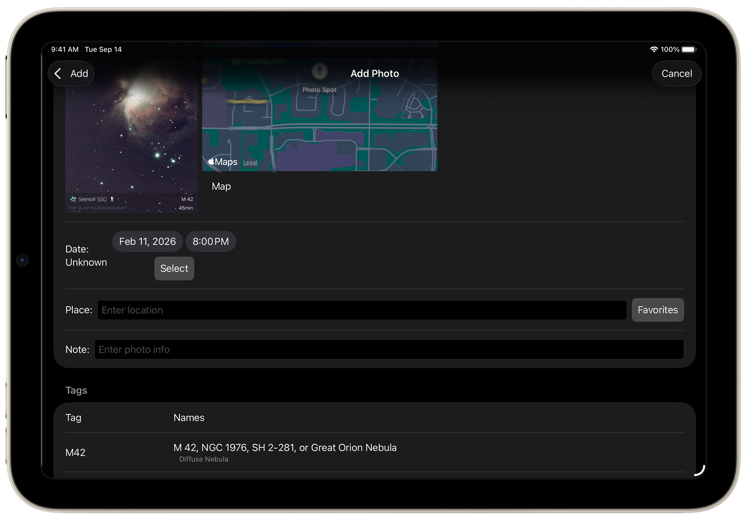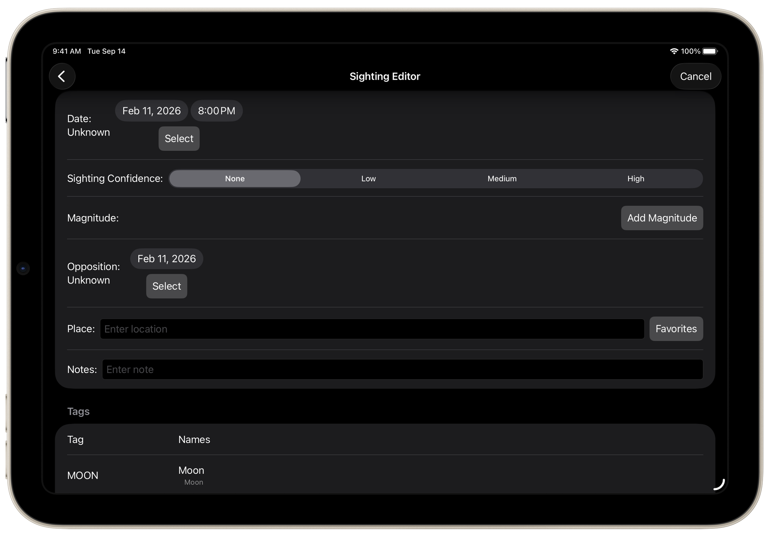 Because not all astronomy viewing can be recorded in a photograph, Sightings is a special option for recording details of observations without photos. Record the details of a sighting — date, confidence, magnitude, opposition, place, notes, and tags.
